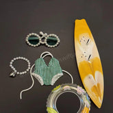 Glasses + swimsuit + necklace + lifebuoy + surfboard