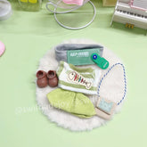 Green suit (including 5 sets, including brown shoes + fishbone pattern short-sleeved T-shirt + sports shorts + cat bag + headscarf)